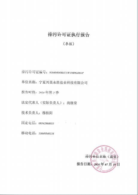 寧夏興昊永勝鹽業(yè)科技有限公司2024年第2季度排污許可執(zhí)行報告